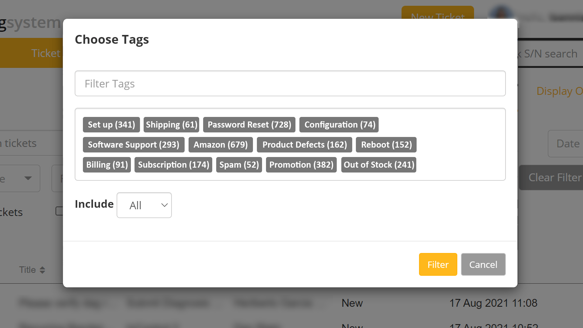 Tickets can be tagged with keywords for better inquiry identification. Users can search and filter tickets using the created tags. Tags display the number of tickets with the corresponding keyword and will also be shown in open ticket conversations.